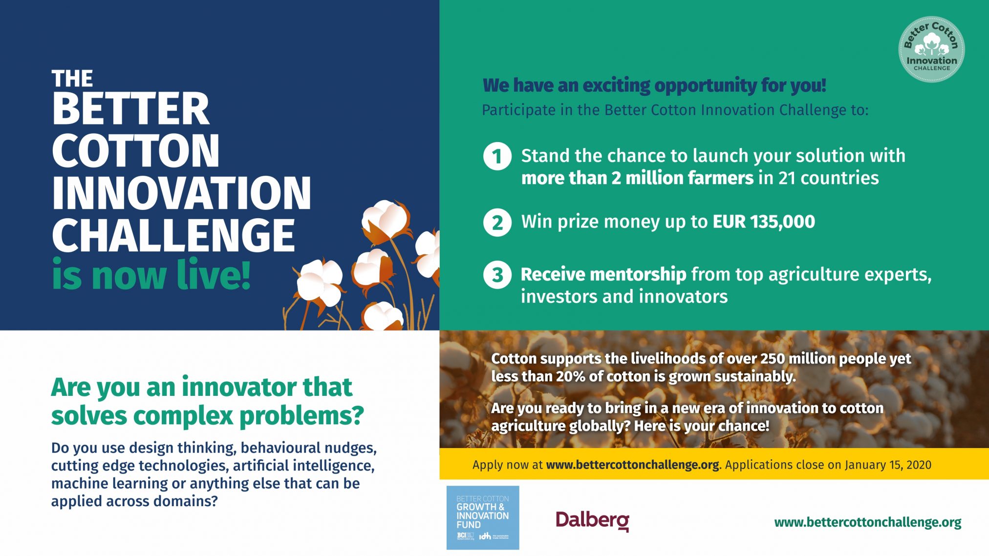 在Dalberg Advisors的支持下,改良棉花倡议(BCI)和IDH发起了“改良棉花创新挑战”——寻求创新的想法和解决方案,以改善世界各地的可持续棉花种植实践。